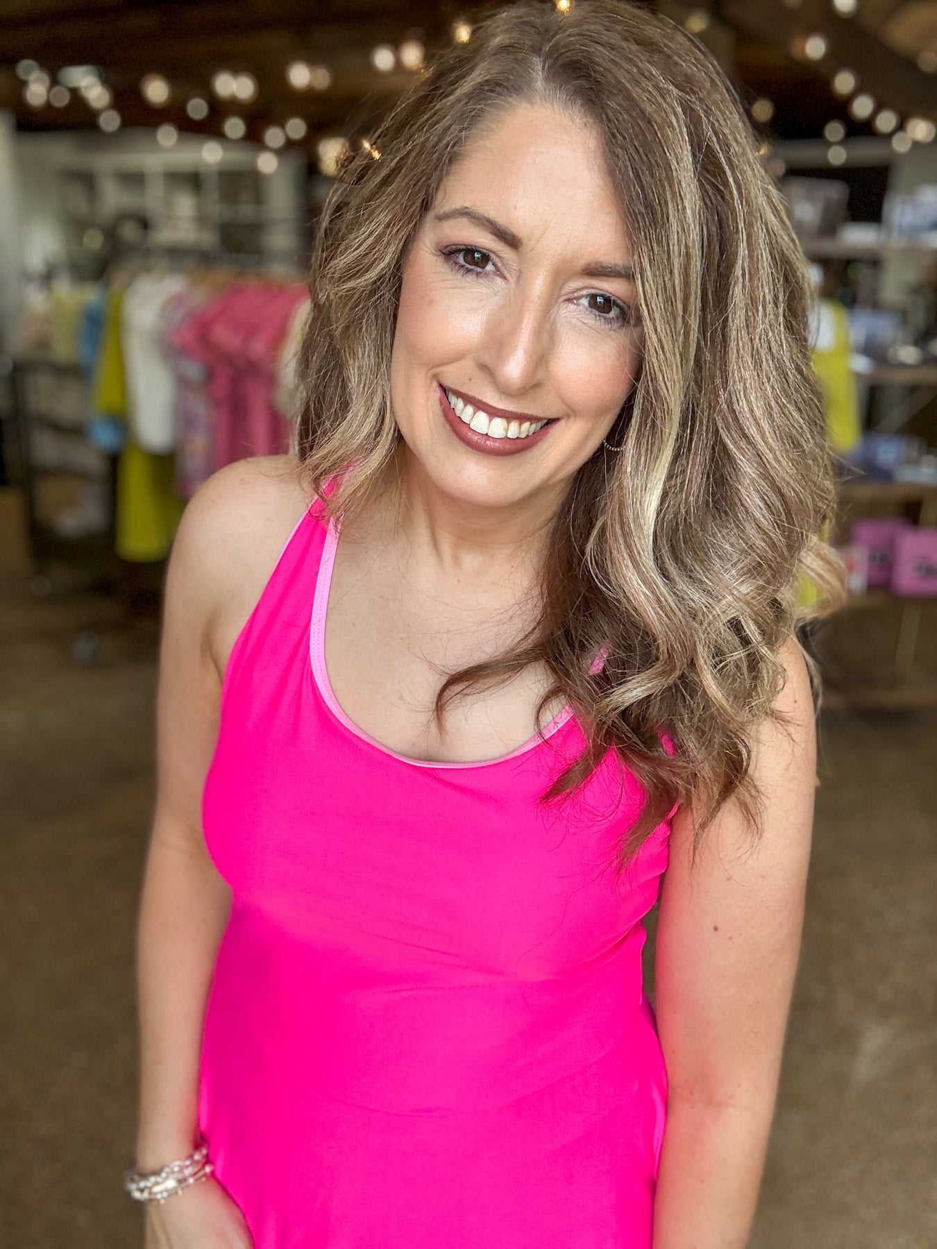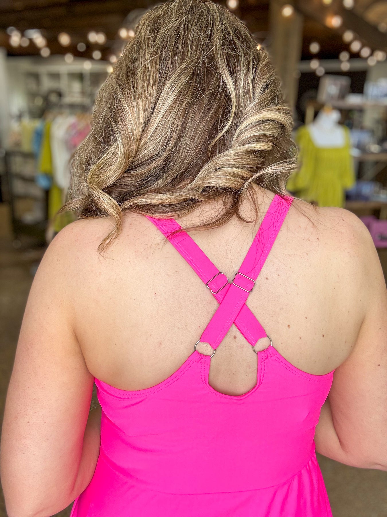 The Don't Be Shy Dress combines bold rose red with striking contrast trim at the neckline for a confident, eye-catching look. Built-in shorts provide coverage and freedom of movement, making this piece perfect for active days. The 85% polyester and 15% elastane blend offers durability with stretch, ensuring comfort whether you're working out or running errands. A versatile piece that transitions seamlessly from gym to casual wear.