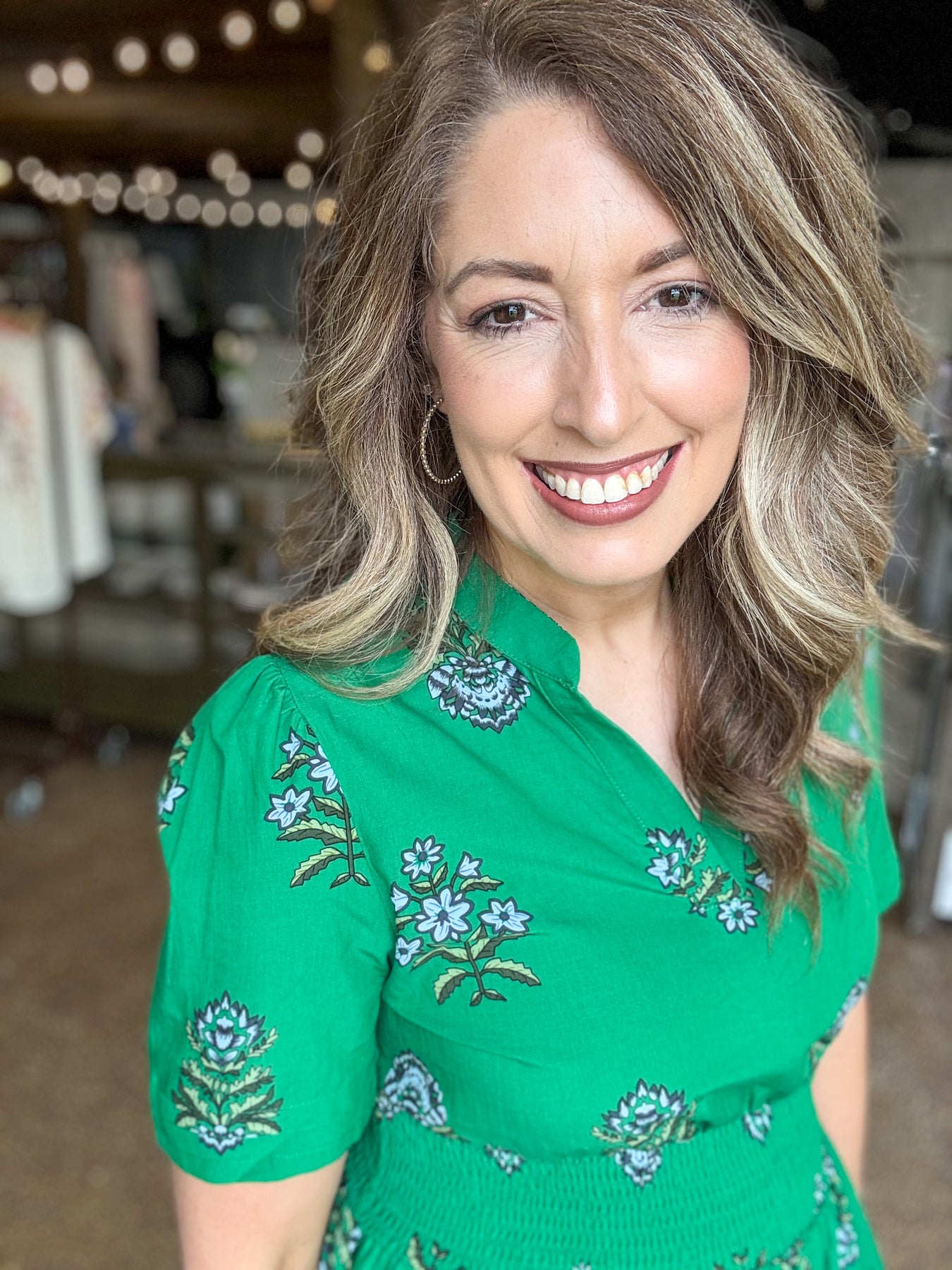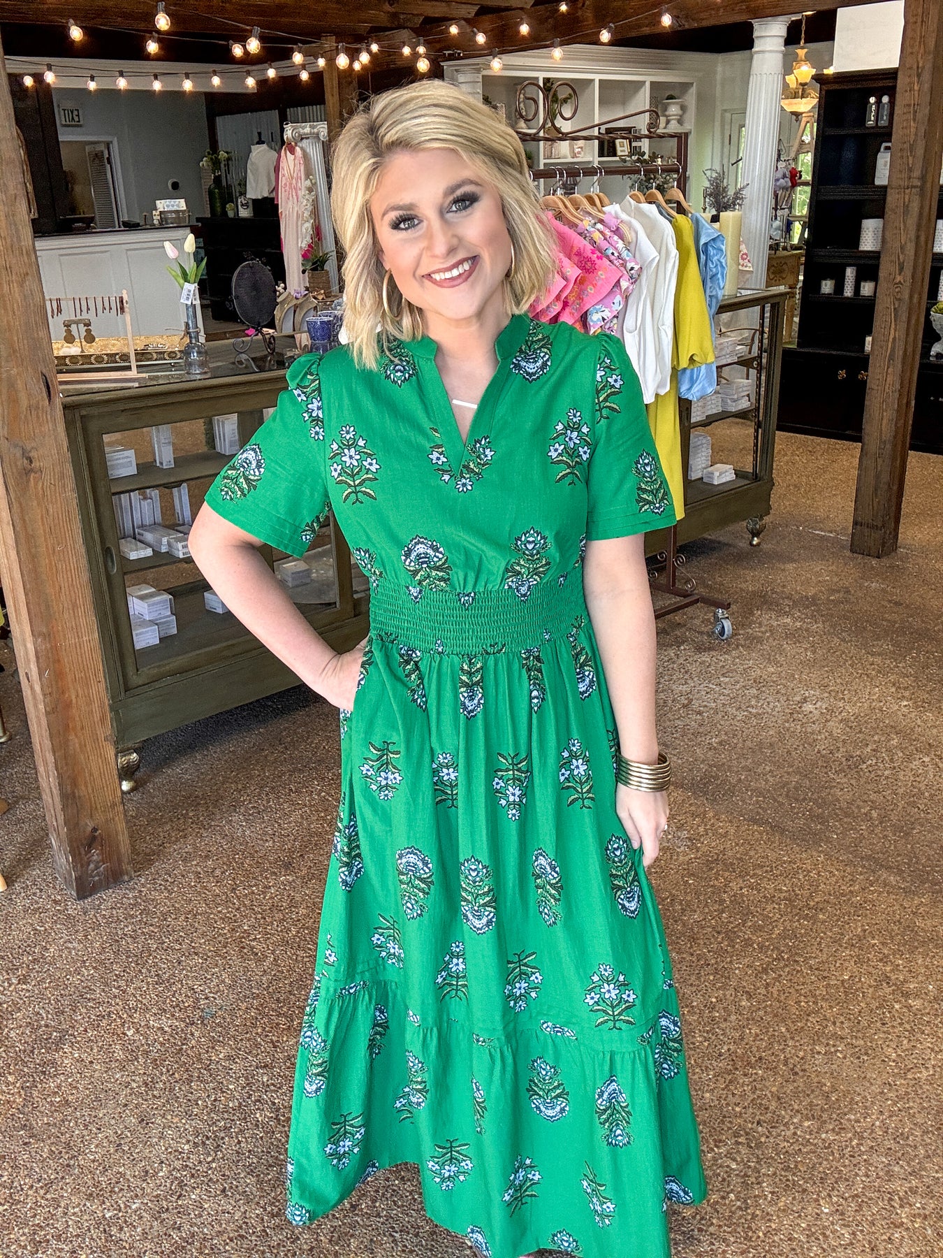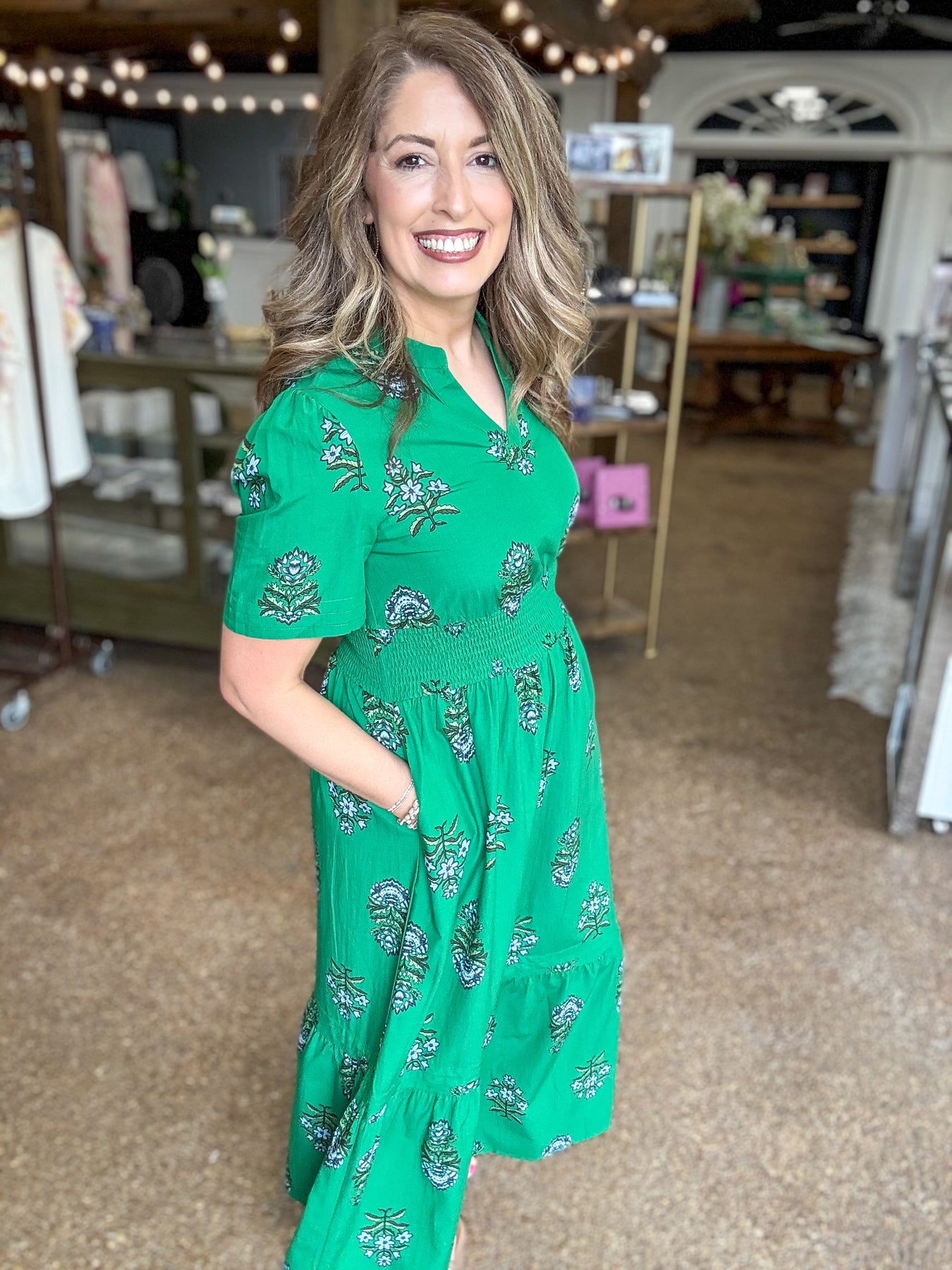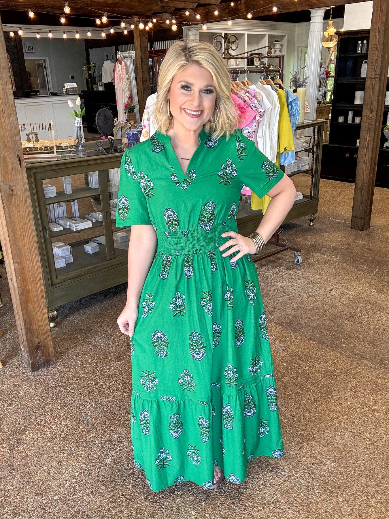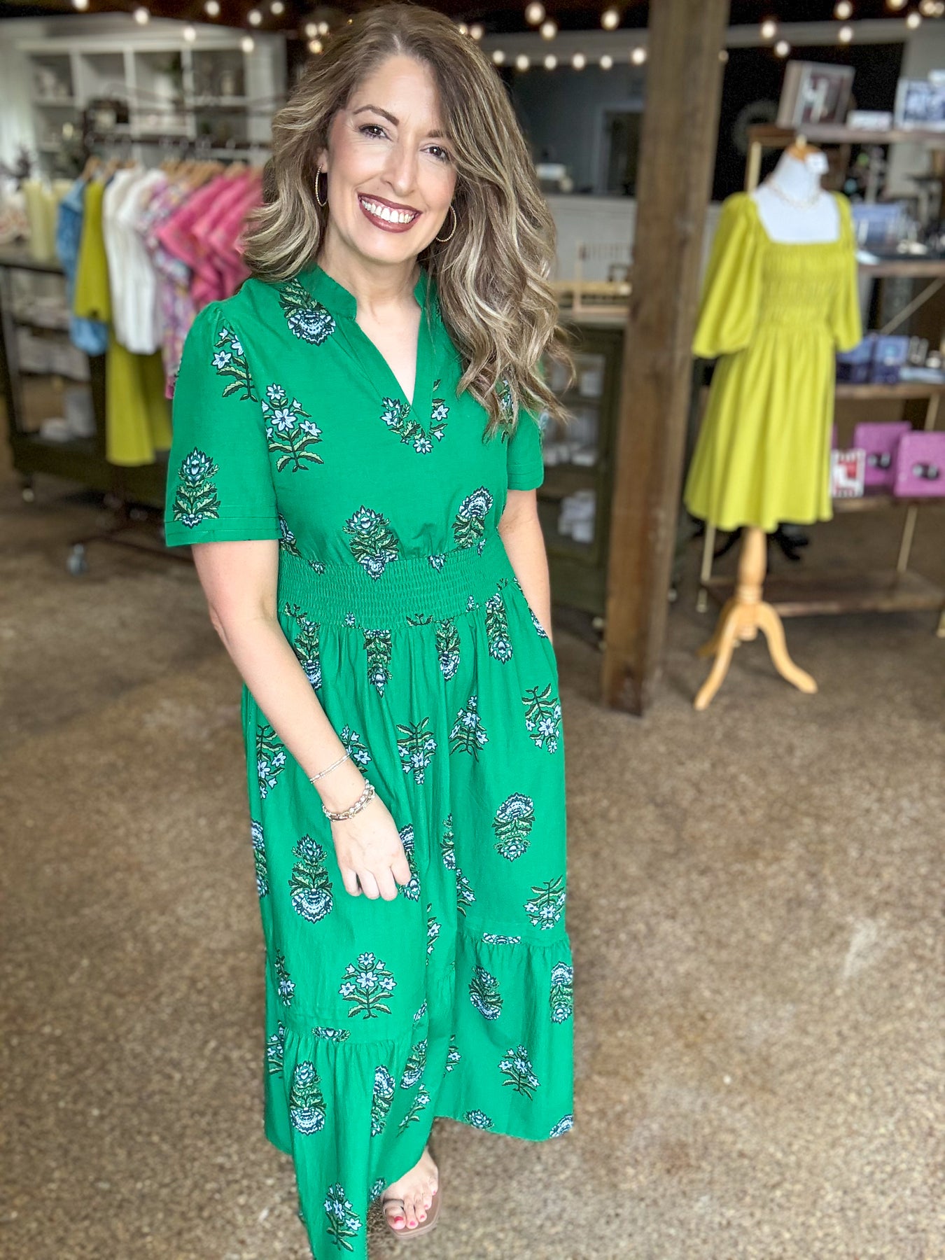 Effortless elegance meets timeless style in this green floral maxi dress. The split neckline and shirred high waist create a flattering silhouette, while the delicate ruffle hem adds movement and charm. Crafted from a breathable cotton-viscose blend, this dress transitions seamlessly from day to evening wear.
