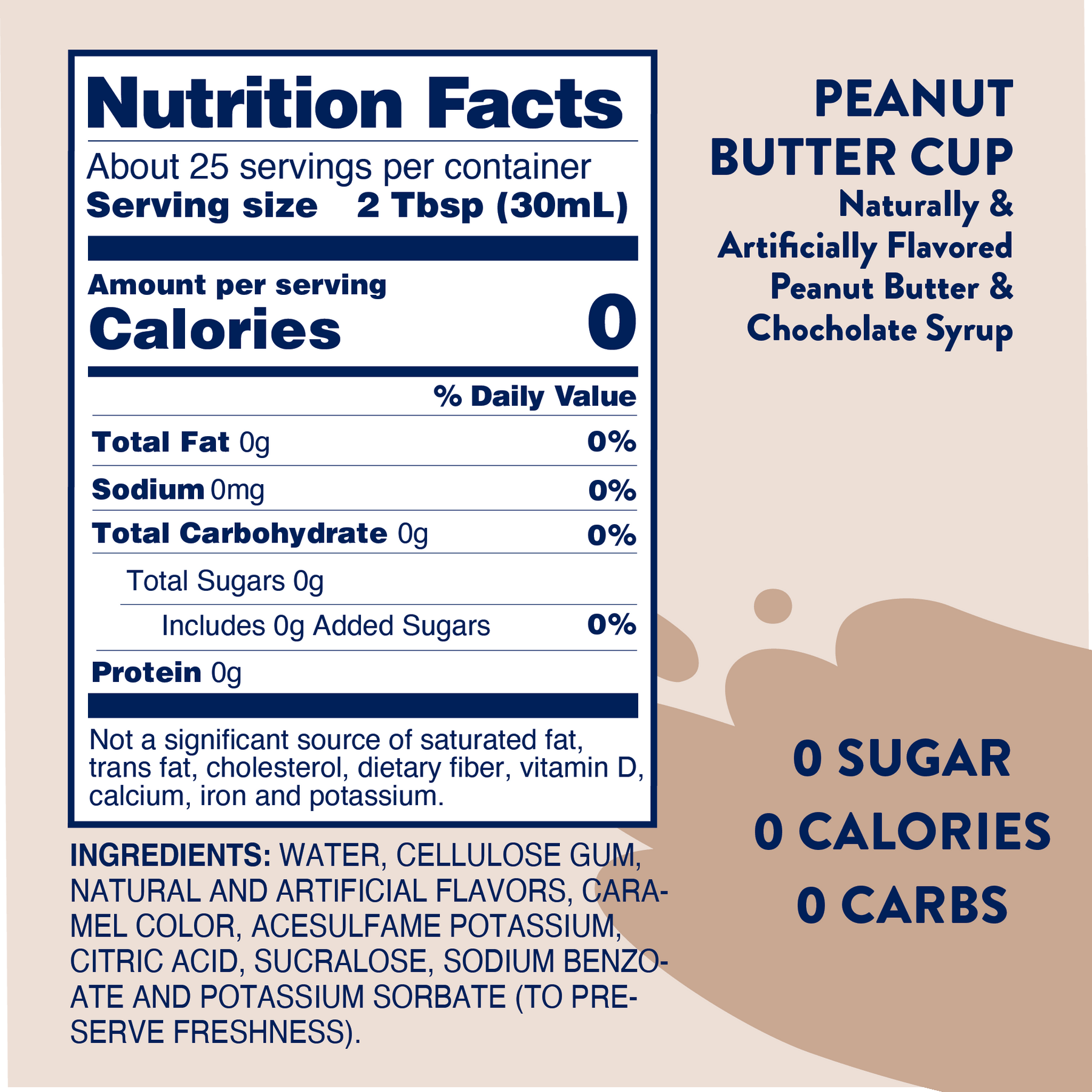 Sweet and silky milk chocolate pairs with creamy, rich peanut butter flavor to create the perfect syrup that tastes indulgent, but is guilt-free. Add guilt-free flavor to coffees, lattes, tea, protein shakes, smoothies, baking, oatmeal, or just about anything. 🚫 0 Calories. 0 Sugar. 0 Carbs. πŸ’° 750 ml/25.4 fl. oz. Bottle - 25 Servings! βœ… Gluten-Free & Kosher. 🌱 Keto-Friendly. πŸ‡ΊπŸ‡Έ Made in the USA.